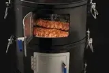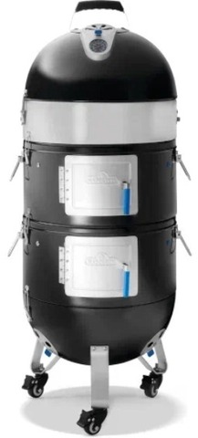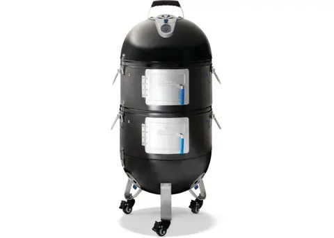 Вертикальная установка всех элементов превращает смокер в конструкцию с двумя решётками, крючками, ёмкостью для воды и колосниковой решёткой для углей, щепы или чанков. Это позволяет коптить продукты на разных уровнях, создавая разные микроклиматы. Без ёмкости для воды смокер работает как классическая вертикальная коптильня, а с ёмкостью и холодной водой или льдом — как смокер для влажной среды, что снижает температуру и улучшает вкус копчёных блюд. Для увеличения высоты коптильни можно использовать дополнительные ярусы (арт. N010-1802).